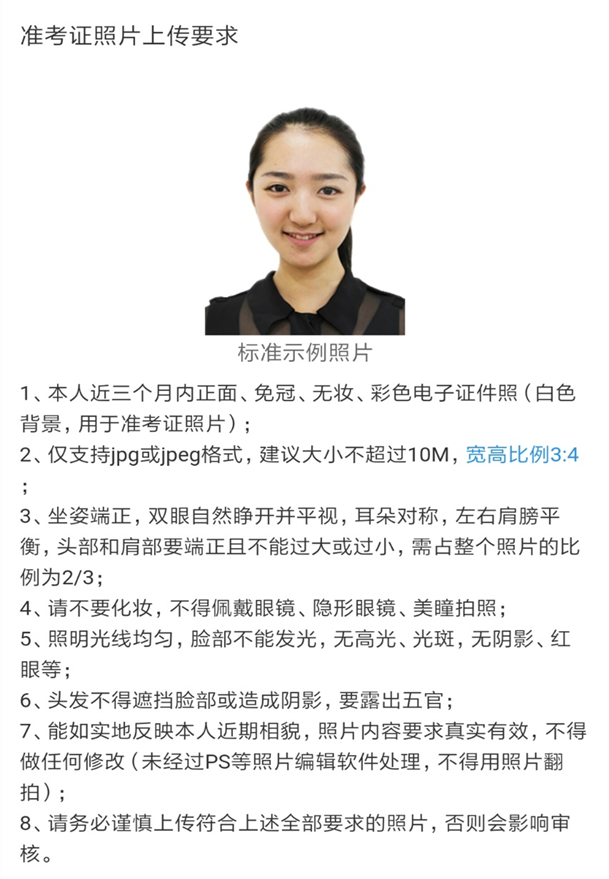 (1) 本人近三月内正面、免冠、无妆、彩色电子证件照(白色背景),照片要求见下图