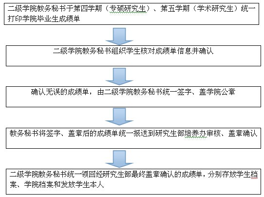 6、研究生在学期间,因联系出国或其他用途需开具成绩单的,可持本人研究生证到二级学院教务秘书处打印成绩单,经确认无误,由二级学院教务秘书在成绩管理位置签字、加盖二级学院公章确认后到,学生到研究生部培养办确认盖章。