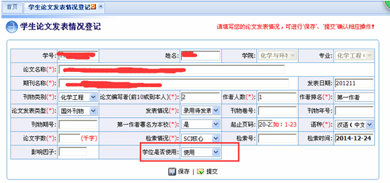 2、“作者排名”、“发表情况”、“检索情况”必须填写正确,若填写不正确,会影响学位审批。“检索情况”请根据自己所发表的论文实际情况填写,若不清楚期刊所属类别请咨询所发表论文的期刊社。