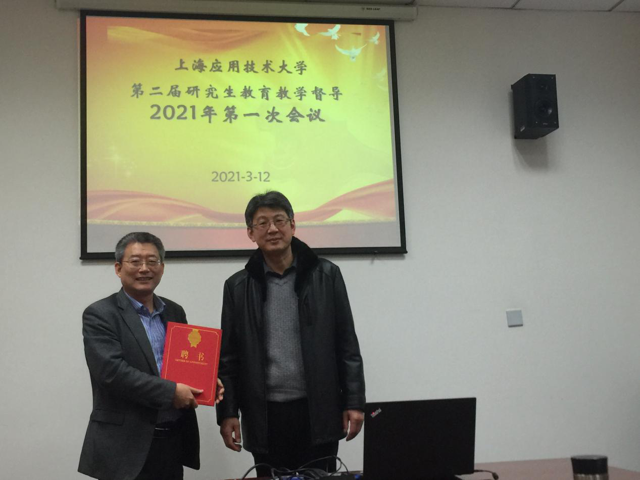 房永征院长介绍了我校近年来在研究生招生、学位点建设、研究生人才培养等方面取得的成绩,介绍了研究生教育会议后,国家加强学位与研究生教育的有关要求和我校的建设目标与举措,对督导老师们的辛勤付出表示感谢,对督导老师们对研究生的教育教学督察和反馈从而提高研究生教育质量、协助推动研究生教育教学工作等方面提出殷切希望。房永征院长为第二届研究生教育教学督导颁发了聘书,并与督导老师合影留念。